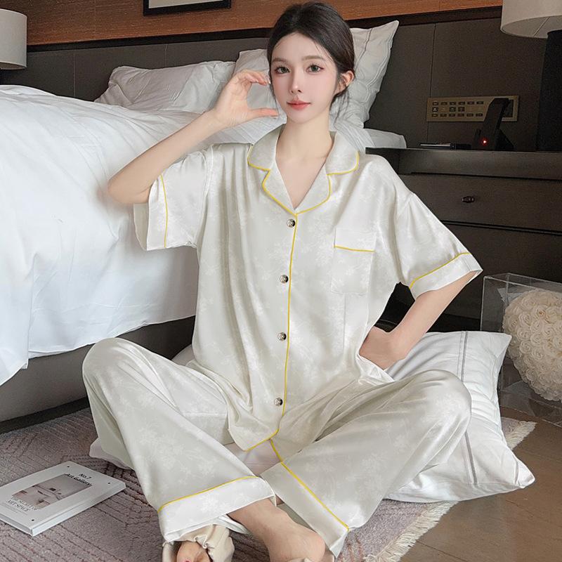 High-Value Simple Solid Color Flower Jacquard High-End Ice Silk Pajamas Women'S Loungewear Short-Sleeved Trousers Set