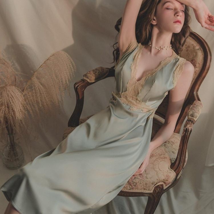 Sexy pajamas women's ice silk summer thin style big beauty back long style knee nightgown new style lace edge pure desire