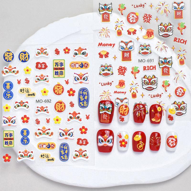 1 Blatt 5D Präge Chinese New Year Löwentanz Nagelsticker Niedliche Glückslöwen Aufkleber Festival Löwe Selbstklebende Maniküre Slider