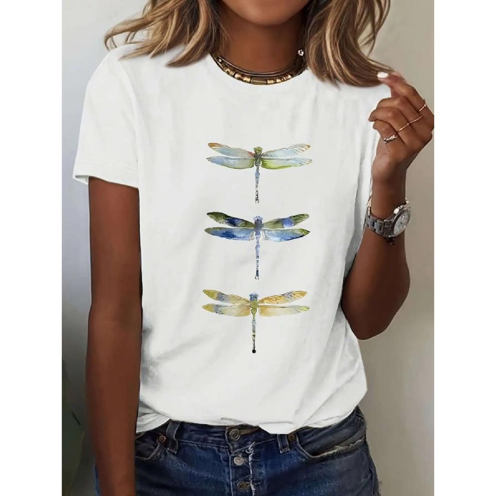 Women's Breathable Dragonfly Graphic Print T-Shirt White Round Neck Short Sleeve Casual Tee Soft for Summer Clothing