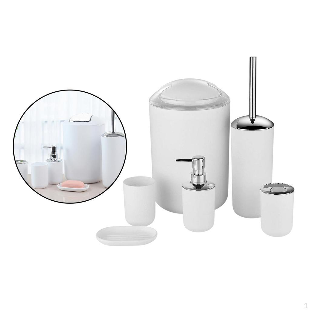 - Bathroom accessories The Set Includes - 1 Tumbler, 1 Toothbrush Holder, 1 Lotion Dispenser, 1 Soap Dish, 1 Bathroom Trash Can And 1 Toilet Brush With Holder.