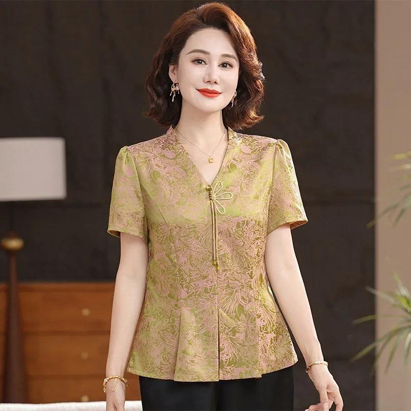 Damen chinesischer Stil V-Ausschnitt Bluse Kurzarm Blumenmuster Froschknopf Elegantes Oberteil für den Alltag