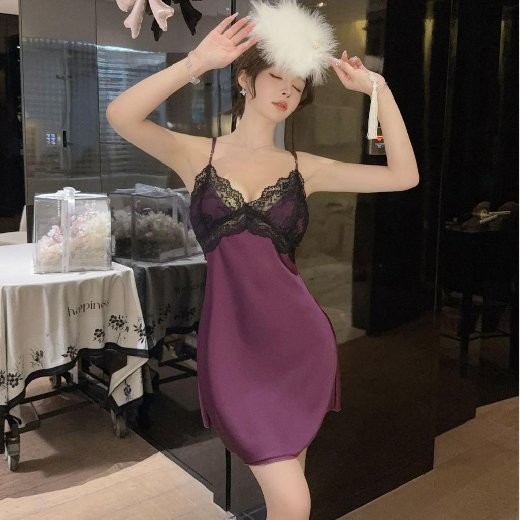 Women's spring summer pajamas ice silk suspenders sexy nightgown nightgown two-piece set imitation silk ribbon chest pad