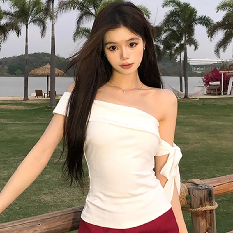 Women's Navy Blue Off Shoulder Sleeveless Top Slim Fit Side Bow Decor Casual Crop Top