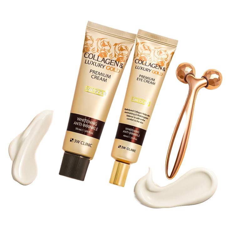 Das 3W CLINIC Collagen & Luxury Gold Premium Faltenlösung Set ist ein luxuriöses Anti-Aging-Pflege-Duo, das durch eine einfache, aber effektive Heimpflege-Routine intensive Faltenpflege, Straffung und Tiefenfeuchtigkeit spendet.