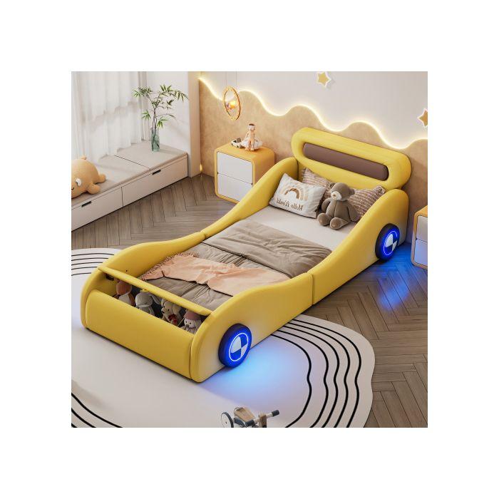 Gepolstertes Kinderbett - MUVOE - 90x200cm - Gelb - Leuchtende Räder - Stauraum