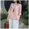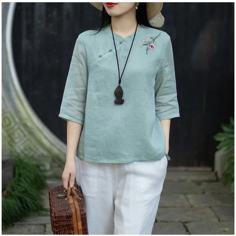 Women's Linen Floral Embroidery Blouse Loose 3/4 Sleeve Casual Top