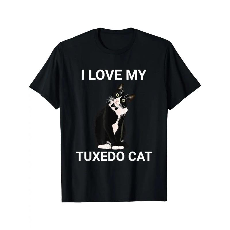 Europäische Größen Herren Schwarzes T-Shirt mit "I Love My Suit Cat" Cartoon-Muster - Lässig, Rundhals, Kurzarm, Normale Passform, Geeignet für Alle Jahreszeiten