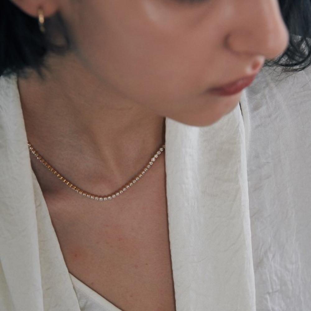 The Un.silver.210 / ronde dew necklace (gold) made of 925 silver features a design with a V-dia chain, elegantly finished with a round stone encased in a gold frame. The stone line that continues along the wrist adds a soft sparkle and a bright touch.