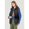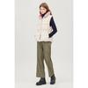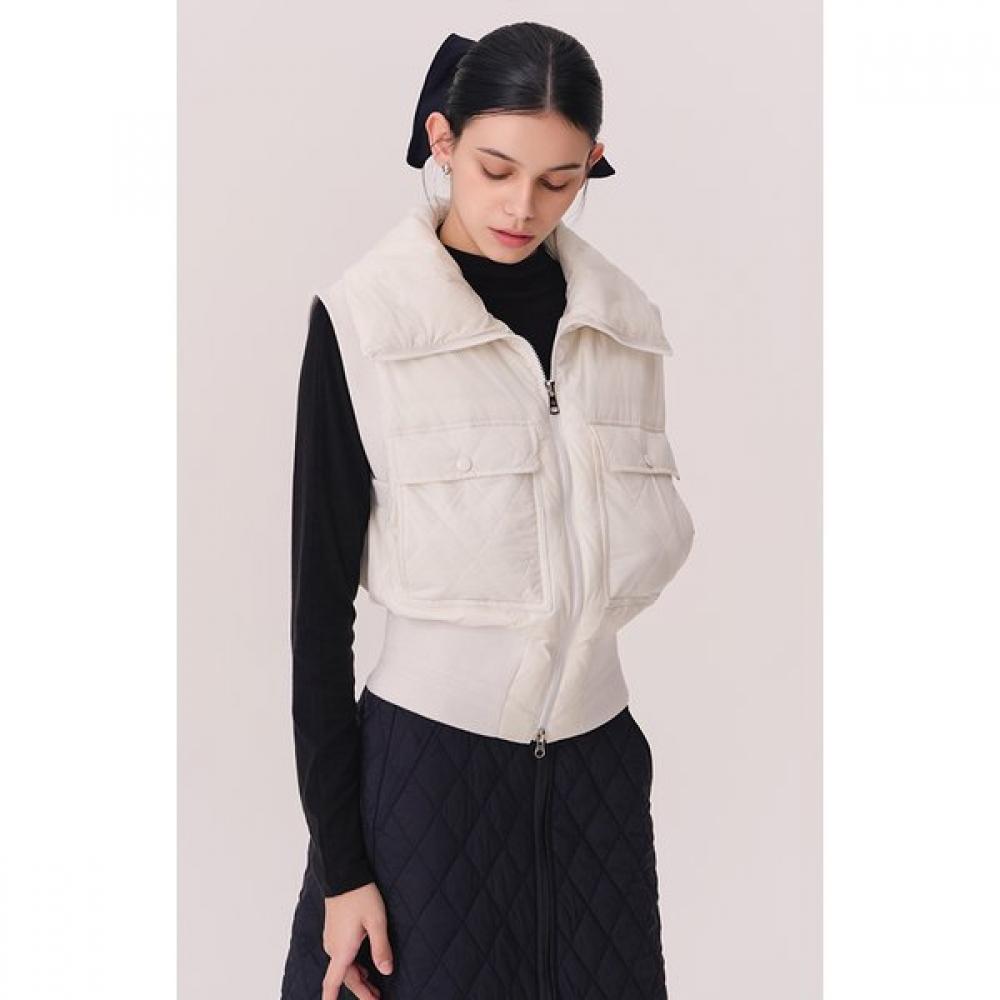 The out-pocket goose down vest boasts unique charm with its big pocket and rib design, catering to women's fashion. It uses premium Hungarian goose down filling to provide lightweight warmth and features knit ribs at the armholes and hem for added luxury and comfort. The high-neck design allows for versatile styling, making it a practical item.