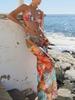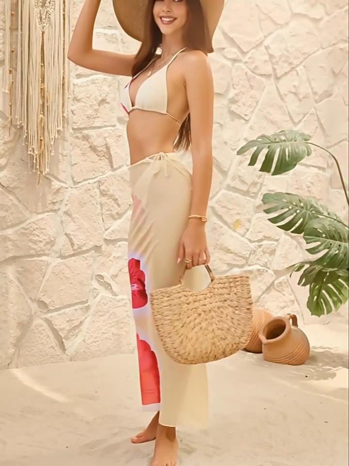 Damen Sexy Sommer Strand Halter Binde Seite String Unterteil Bikini Badeanzug mit Langem Überwurf Kleid, Modisches Bedrucktes 3-teiliges Badebekleidungs-Set