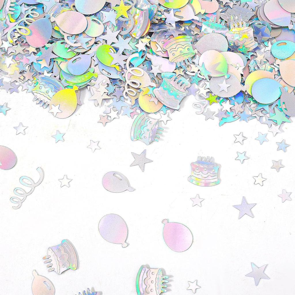600pcs Birthday Confetti, Metallic Birthday Table Scatter Iridescent Party Confetti for DIY Crafts Cake Balloons Stars Ribbons Shapes Festive Table