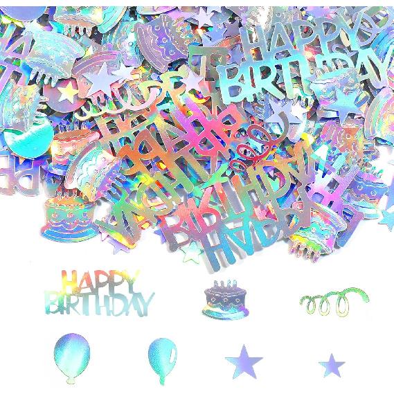 【Creative Design】The confetti features a fun combination of 'HAPPY BIRTHDAY' letters, discs, and festive shapes, adding visual interest to any celebration. The iridescent color shifts under light, creating a dreamy rainbow effect that enhances party decor. Use them to decorate invitations, envelopes, or gift bags for a personalized touch.