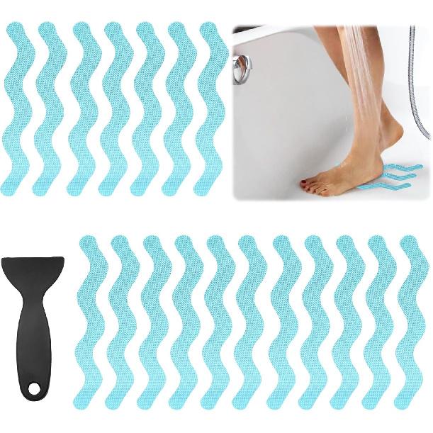 24PCS Bathtub Non Slip Stickers Blue Safety Anti Slip Shower Strips Adhesive Decals Scraper for Bath Tub Stairs Steps Floor Ladders with Premium