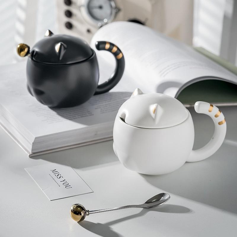 Süße Katze Kaffeetasse Geschenke für Katzenliebhaber Keramiktasse Neuheitstasse mit Deckel und Löffel Weihnachts-Geburtstagsgeschenke Geschenk für Kinder