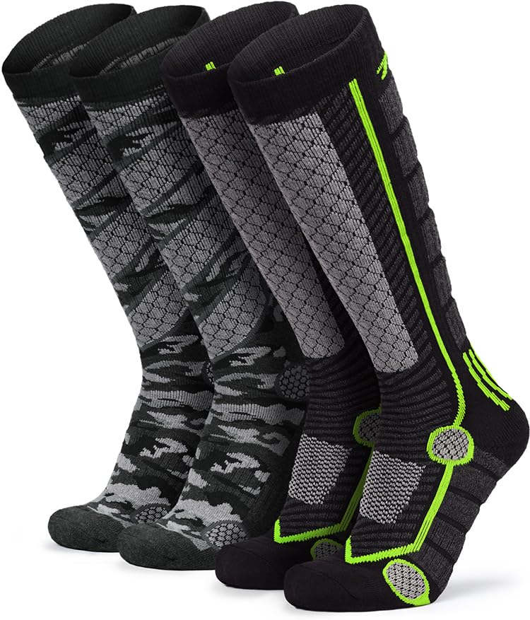 Teslas Ski- und Snowboardsocken sind Wintersportsocken, perfekt für Outdoor-Aktivitäten.. Die dicke, gepolsterte Strickware schützt die Fußsohlen und Schienbeine sanft und reduziert die Stoßbelastung beim Skifahren oder Snowboarden.. Das atmungsaktive Netzgestrick am Spann sorgt für Komfort und verhindert ein Hitzestaugefühl, auch bei langem Tragen.. Diese Socken sind nicht nur zum Skifahren.; Ihre Wärme und ihr bequemer Sitz machen sie für eine Vielzahl von Aktivitäten geeignet, darunter Winterradfahren, Outdoor-Aktivitäten, die Stiefel erfordern, und Pendeln.. Das Kompressionsdesign mit Fußgewölbeunterstützung verhindert ein Verrutschen, und die antibakteriellen, geruchshemmenden und schweißableitenden, schnell trocknenden Eigenschaften machen sie sicher für den täglichen Gebrauch.. Dieses Unisex-Set mit zwei Paar ist einfach zu verwenden.