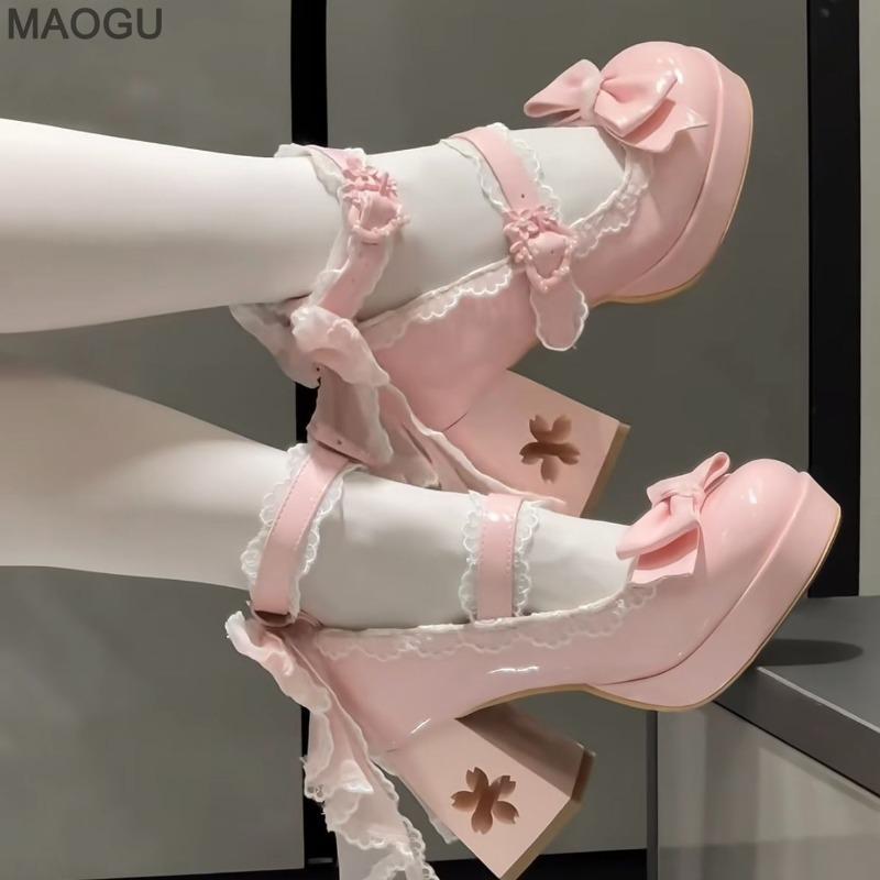 Schöne Mädchen Rosa Lolita Schmetterlingsknoten High Heels Plateau-Schuhe für Damen Süßes Sakura Kleid Mary Janes Beige Größe 34-42