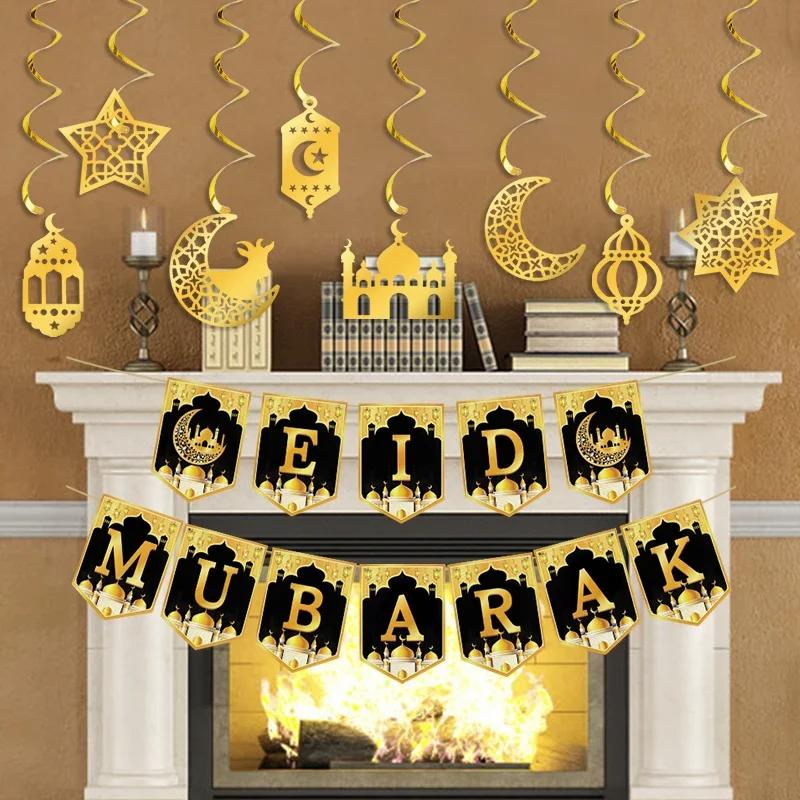 1-10 Stück Festival Feier Gold und Schwarz Ramadan Hängendes Banner Papierlaternen Halbmond Ornamente für Heimbedarf