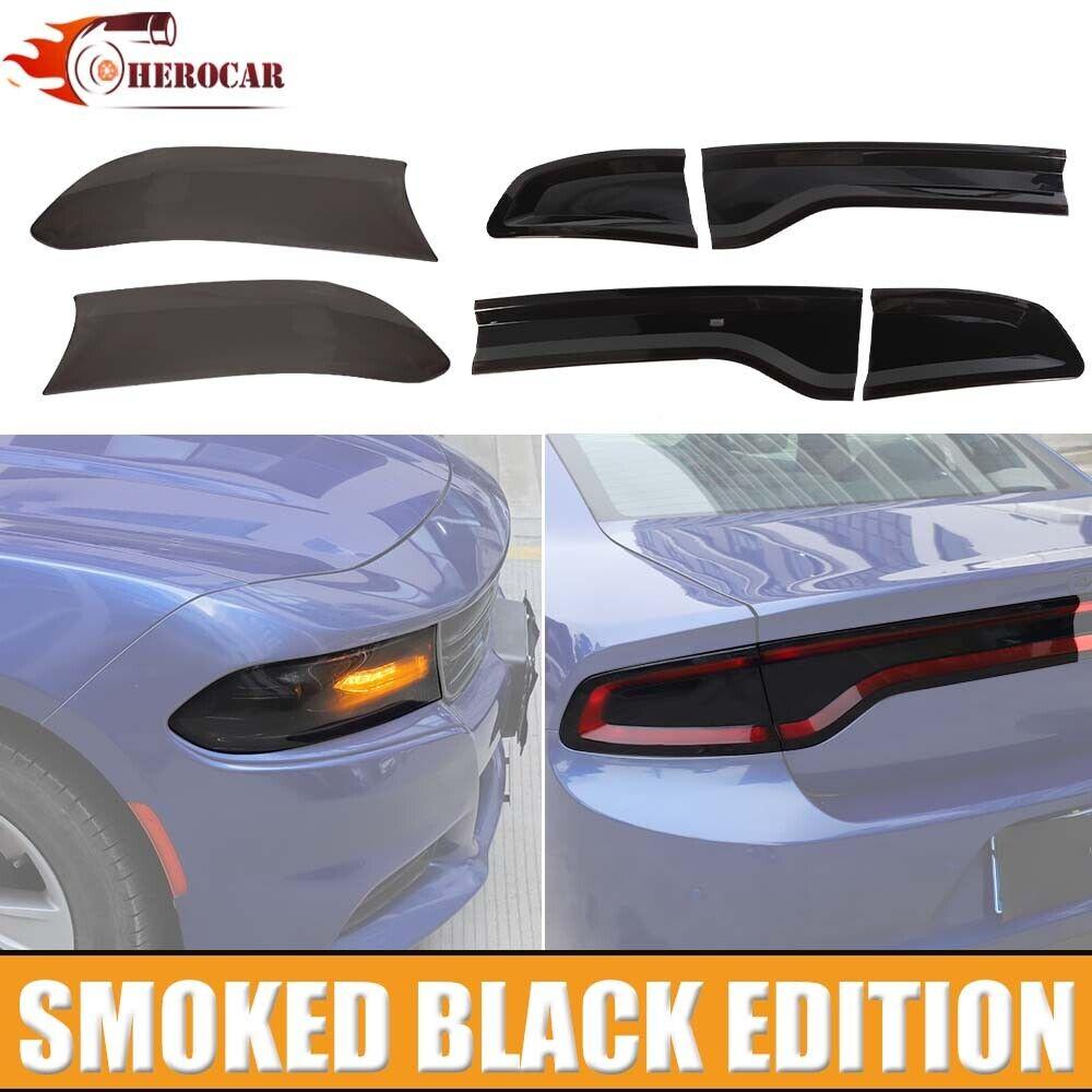 Front Head Light & Rear Tail Lamp Covers Kit For Dodge Charger 15+ Smoked Black