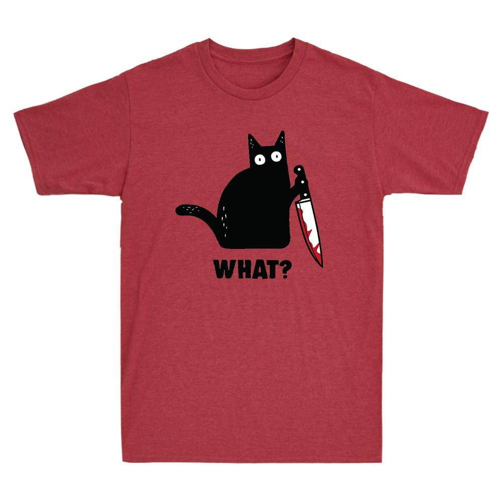 Katze Was? Lustiges Herren-T-Shirt mit schwarzer Katze – Mörderische Katze mit Messer – Katzenliebhaber-T-Shirt (Unisex)