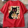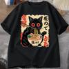 Vintage Japanische Schwarze Katze Ramen Damen T-Shirts Niedliche Grafik Lustige Katze isst Ramen Gedruckt Harajuku Kurzarm Freizeit Oberteil Tee