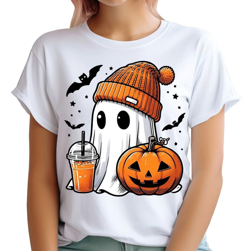 Cozy Ghost with Pumpkin & Beverage Halloween T-Shirt #T447 Unisex T-Shirt