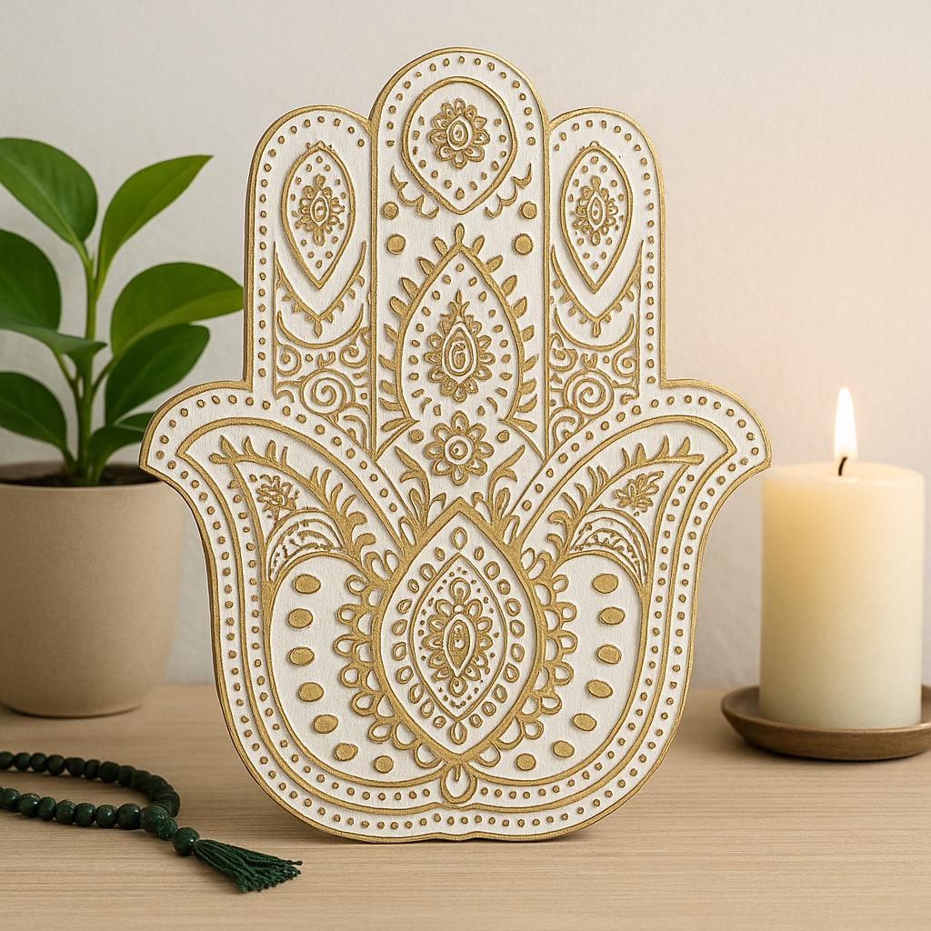 Geformt als die Hamsa – eine offene Hand, die in vielen Kulturen von Westasien bis Nordafrika verehrt wird – wird sie weithin als Zeichen des Schutzes, des Segens und des Willkommens angesehen.. In Häusern und am Arbeitsplatz wird die Hamsa-Kunst oft dort platziert, wo das tägliche Leben stattfindet, als Erinnerung an Freundlichkeit und achtsames Bewusstsein.. Hergestellt in Indien, balanciert diese Plakette Symmetrie und Detail: Florale und tropfenförmige Motive fließen in erhabenem Relief, mit gepunkteten Akzenten, die das Licht einfangen.. Ein weißer Hintergrund sorgt für eine helle und luftige Stimmung, während metallische Golddetails und eine feine Goldkontur einen sanften, leuchtenden Akzent setzen.. Die taktile Oberfläche lädt zu einem langsameren Blick ein.; Von der anderen Seite des Raumes aus bildet es einen ruhigen Blickfang, der mit natürlichen Hölzern, Leinen und Stein harmoniert.. ✨