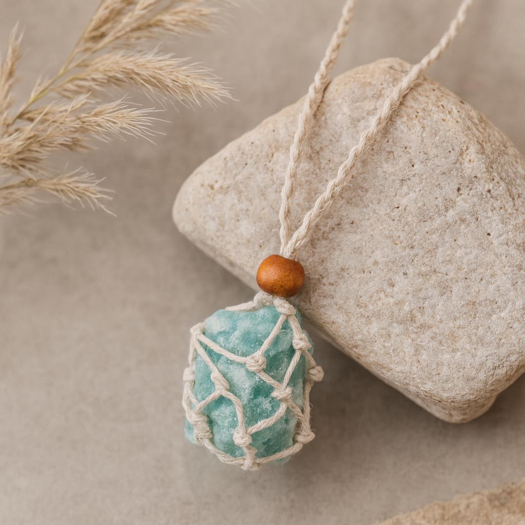 Die Oberfläche des Steins ist unregelmäßig und lebendig in Meeresglas-Tönen, eingebettet in ein ordentliches weißes Makramee-Netz, das ihn sicher hält und gleichzeitig das Licht über seine Facetten spielen lässt.. Eine glatte, runde Perle in warmem Braun sorgt für eine dezente Pause zwischen Schnur und Kristall und gleicht Textur und Ton aus.. Der verschlusslose Abschluss sorgt für einen sauberen und mühelosen Look.. 🌿