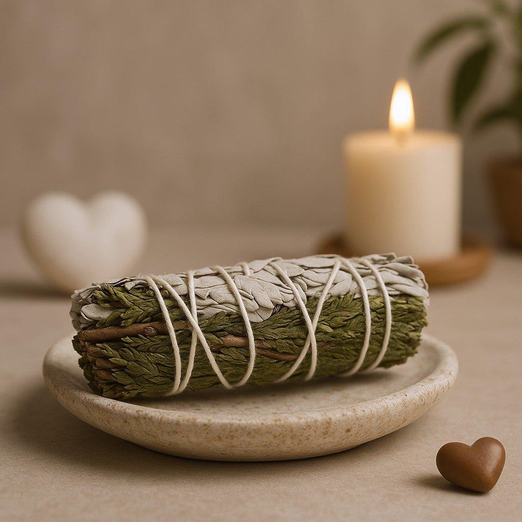 Das Bündel glimmt langsam und gibt stetigen, aromatischen Rauch ab: frische, kampferartige Noten von blassgrauen Salbeiblättern und warme, holzige Tiefe von der tiefgrünen Zeder. Der Rauchstrom ist sanft und erdend und wird oft verwendet, um symbolisch schwere Energie zu reinigen und Gleichgewicht in einen Raum zu bringen.. 🌬️