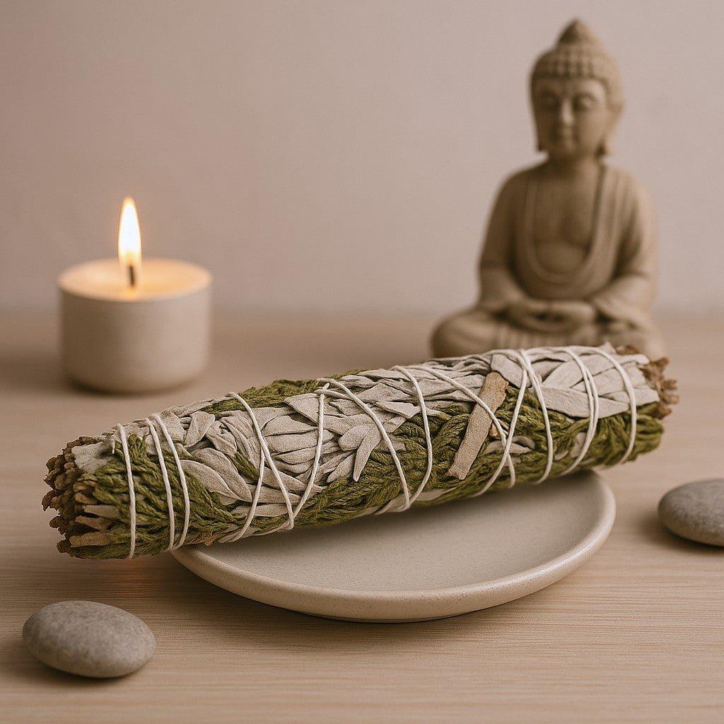 Wenn angezündet, glimmt es in einer gleichmäßigen Rauchsäule aus aromatischem Rauch – reine, krautige Salbei mit warmem, harzigem Zedernholz – traditionell verwendet, um stagnierende Energie zu vertreiben und Gleichgewicht einzuladen.. In vielen indigenen Traditionen Nordamerikas ist weißer Salbei (Salvia apiana) wird zur Reinigung und Konzentration verbrannt, während Zeder für Erdung und Schutz geschätzt wird; Gemeinsam markieren sie Momente des Gebets, der Besinnung und der Fürsorge für den Raum.. 🔥