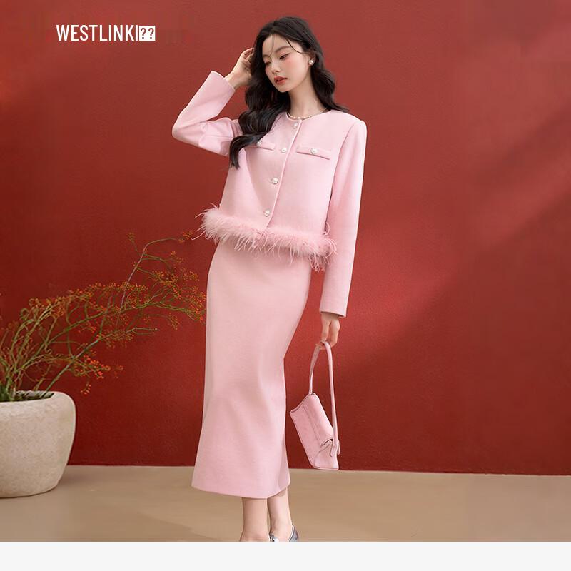 Westlink Pink Tweed Skirt Set with Pearl Buttons