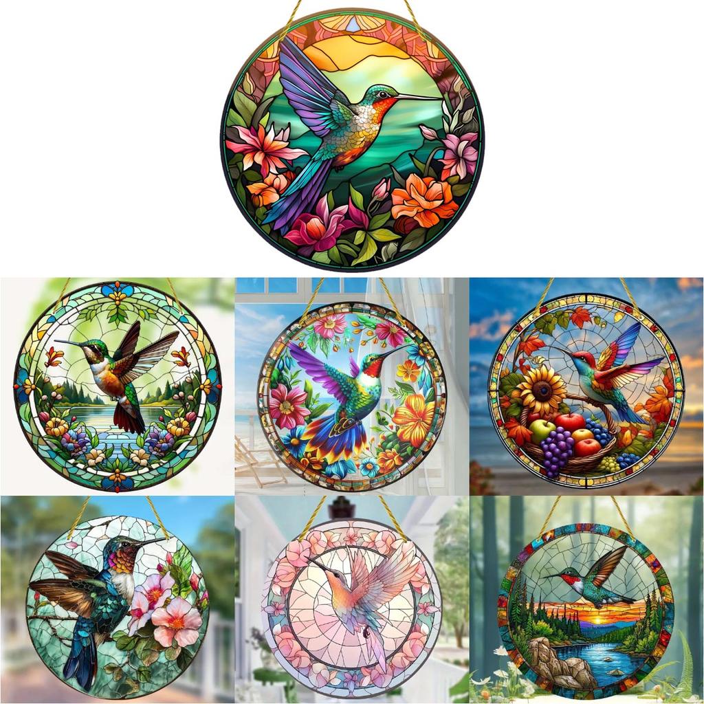 NEW Acrylic Painted Hummingbird Pendant Bird Floral Pattern Suncatcher Round Wreath Porch Window Outdoor Patio Hanging Ornaments