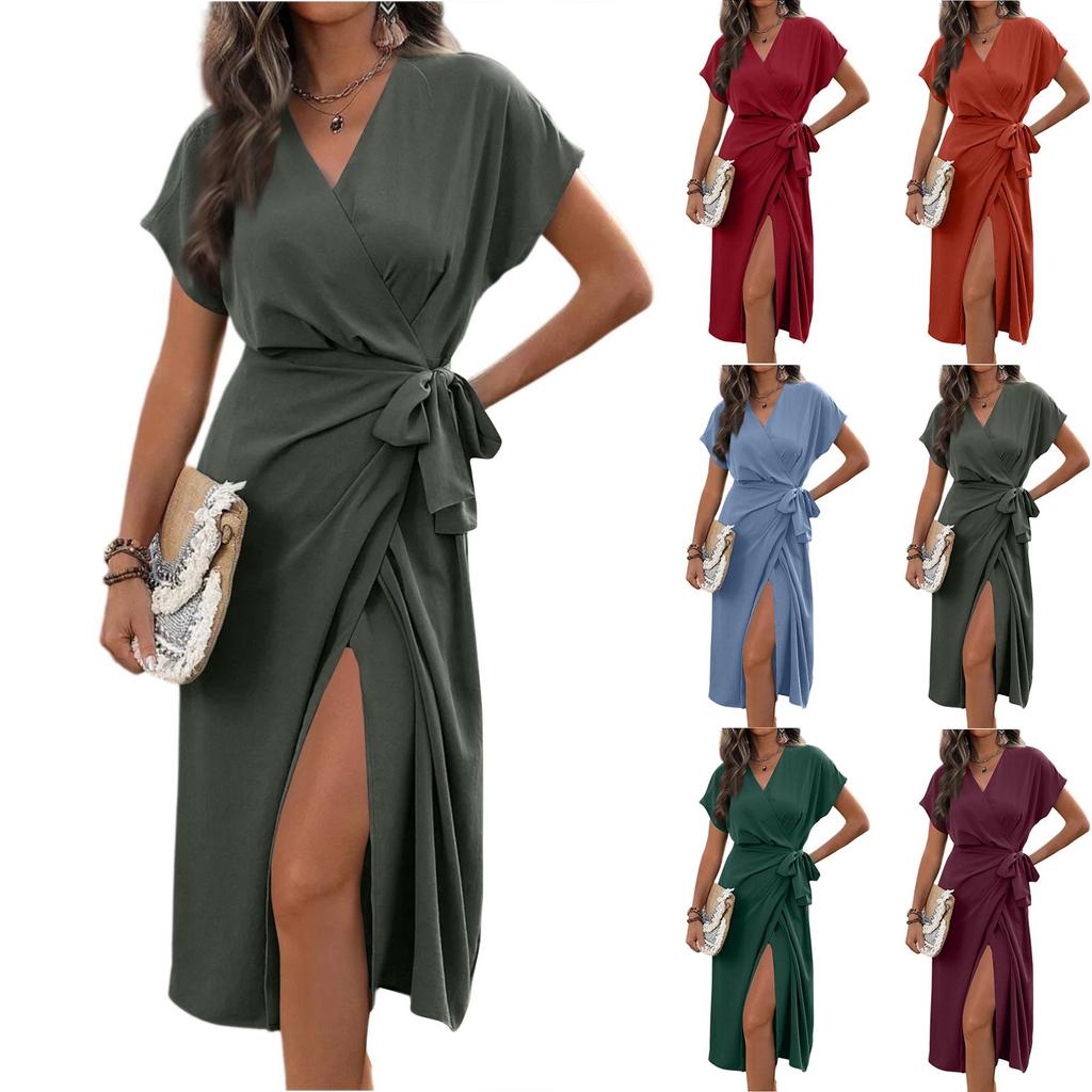 Damen V-Ausschnitt Wickelkleid Gedreht Schlitz Plissee Taille Bindegürtel Kurzarm Sommer Midi Kleider
