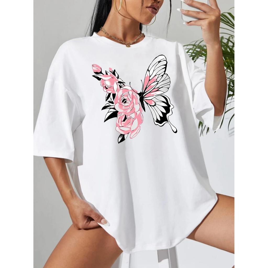 Butterfly art pattern round neck women T-shirt short sleeve fashion printing half sleeve shirt stretch T-shirt