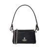 The Vivienne Westwood Hazel Napa Chain Crossbody Bag is crafted from luxurious Napa leather. It includes a detachable shoulder strap and features a main compartment along with a small zipper pocket. Its sophisticated design allows for various wearing styles.
