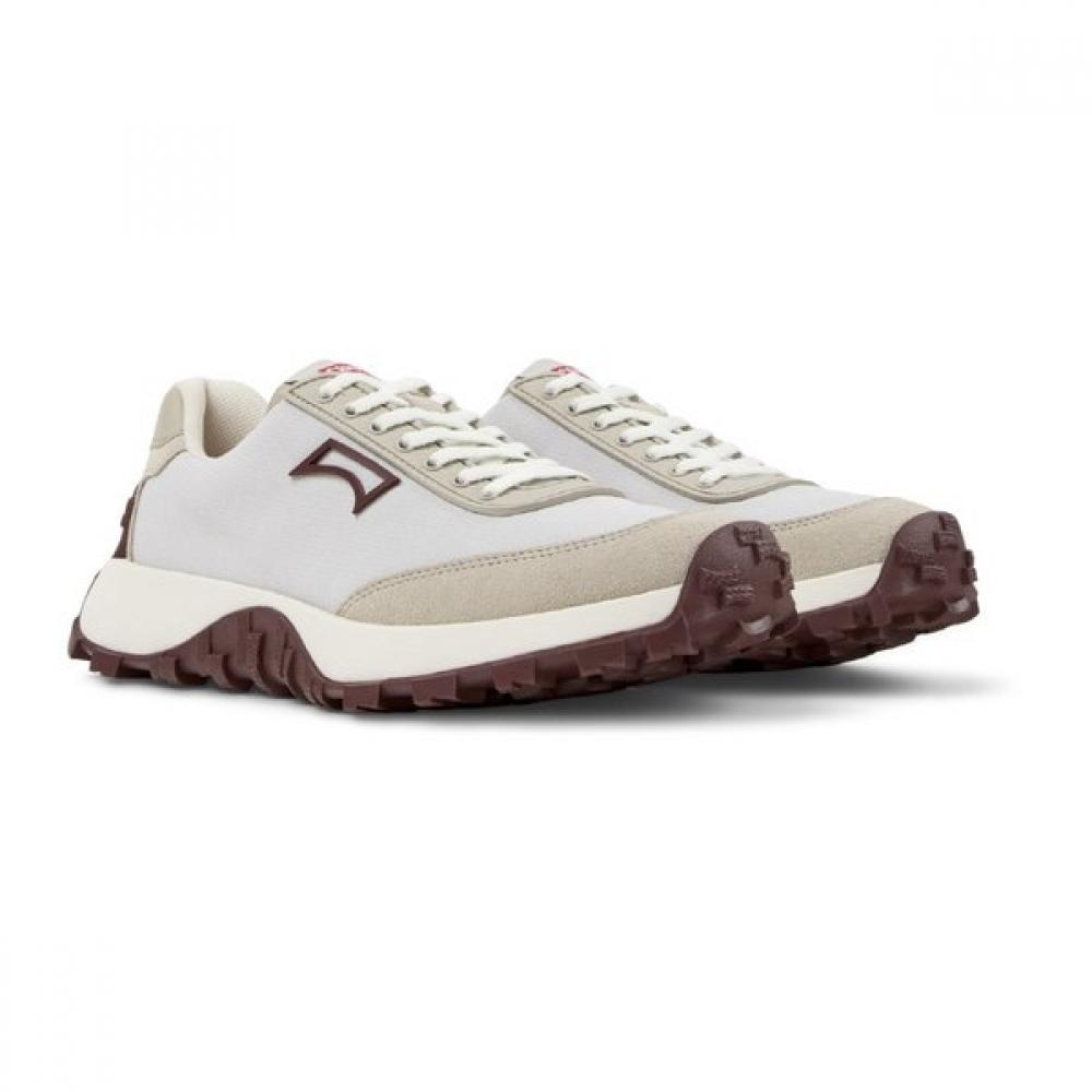 The Camper Drift Trail K201462-053 is a women's sneaker for the 26SS season, featuring a vintage aesthetic and a technical low-top design. The use of gray and beige textile and calf suede materials gives it an elegant feel. The insole is made of a removable OrthoLite® Recycled™ footbed, providing cushioning and comfort while incorporating recycled materials. The midsole is made of EVA for added lightweight comfort, and the outsole, made with Vibram® Ecostep, offers better durability and stability while containing 30% recycled PET and leather materials. Designed with a wide calf, it is suitable for various activities and ensures comfort for all-day wear.