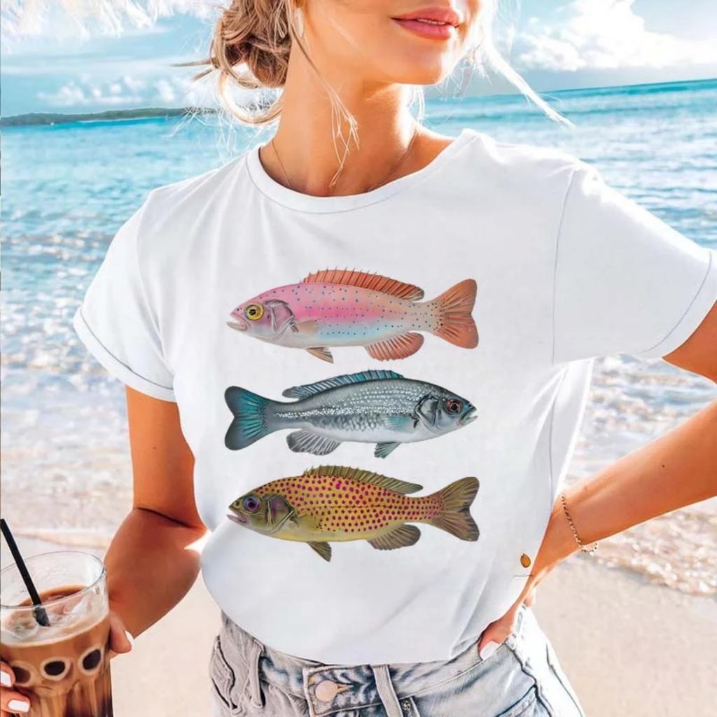 Watercolor Cute Cartoon Fish Pattern T-Shirt 90s Short Sleeved Women's Fashion O-Neck Clothing Printed Casual Top Summer T-Shirt