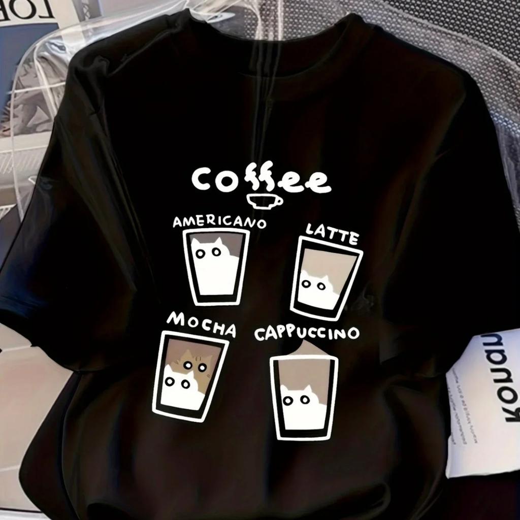 Süße Katze im Tassen-Print T-Shirt Damen Kreativität Sommer Rundhals Kurzarm Streetwear Oversized Lässig Locker Oberteile Streetwear
