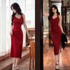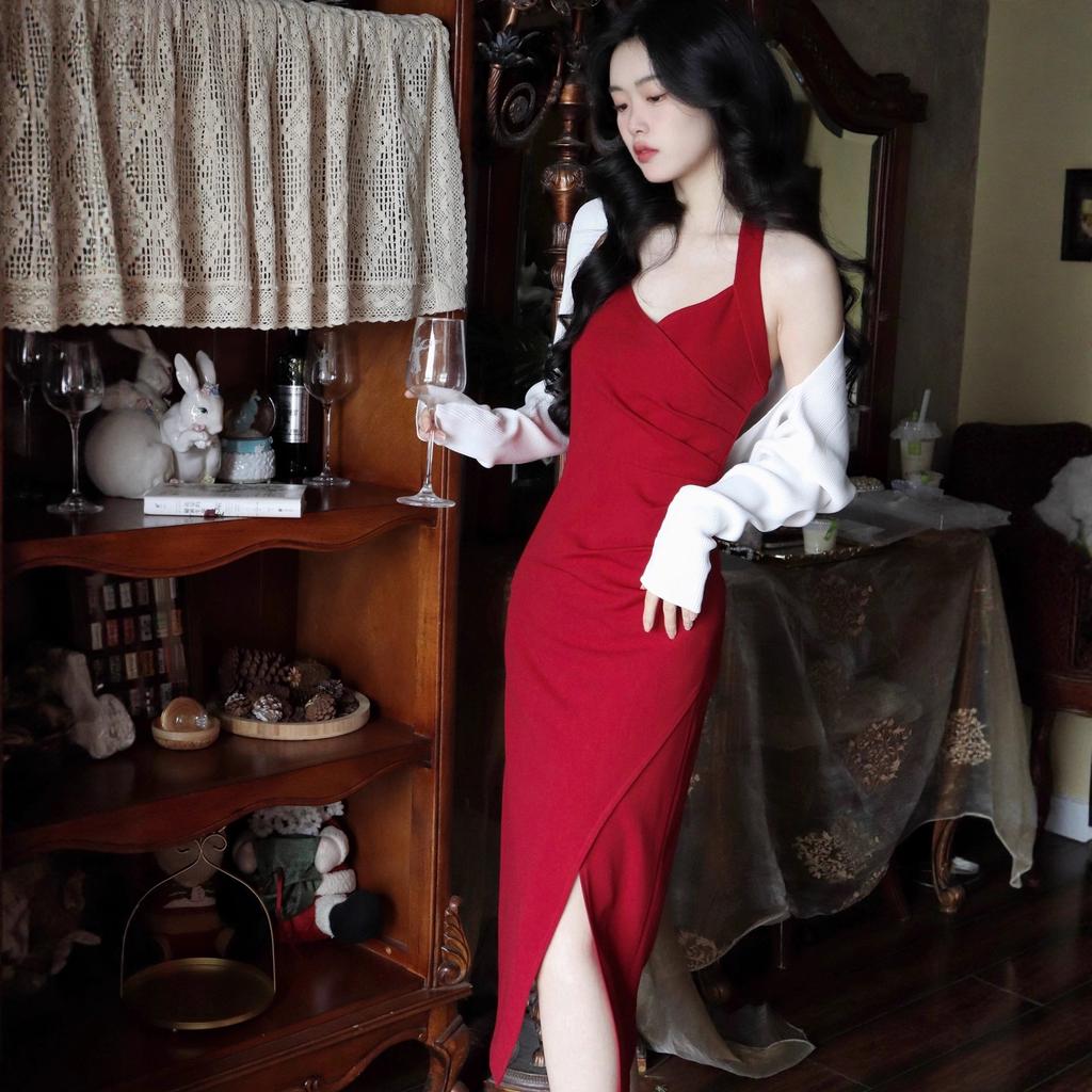 L Sexy temperament neck sling banquet dress dress woman, sleeveless waist split fork solid color hip wrap dress