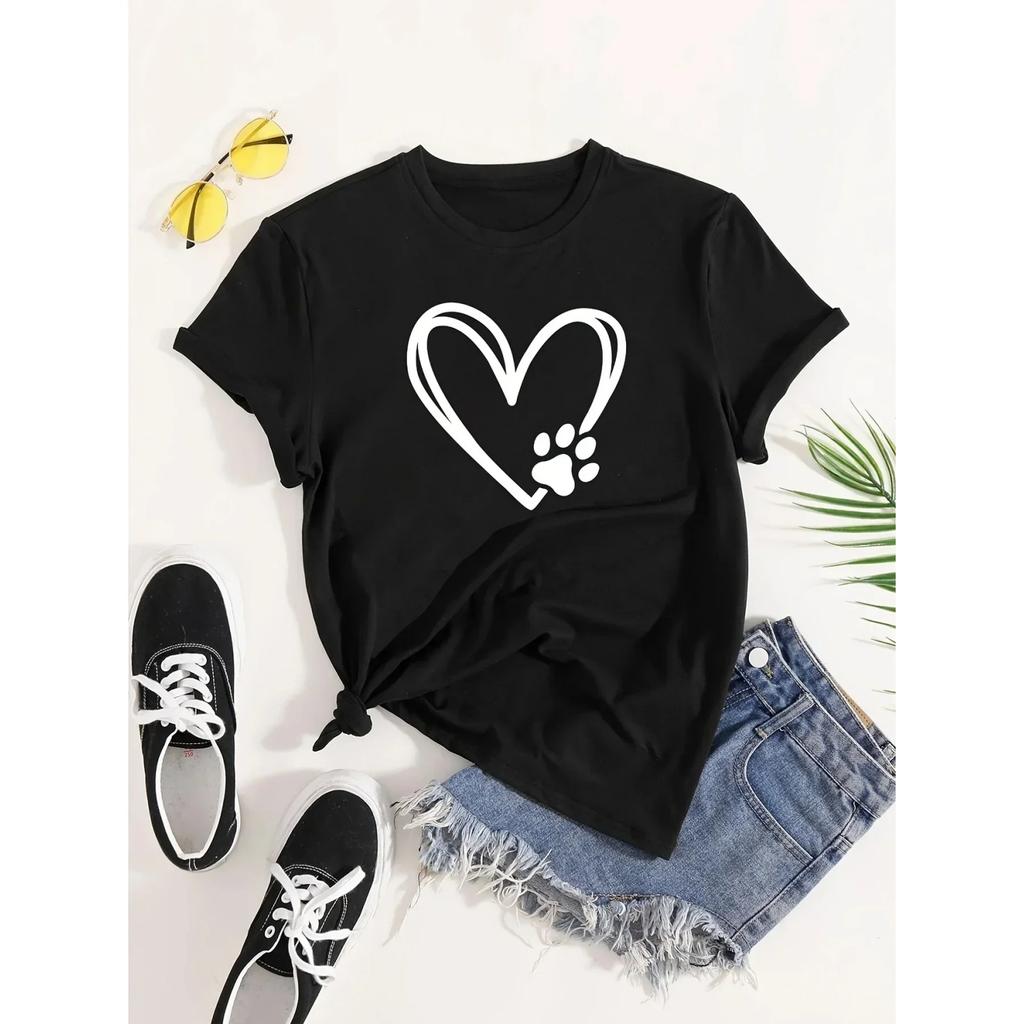 Herz & Hundepfotenabdruck Kurzarm-T-Shirt, Damen Leichte Stretch Rundhals Freizeit-T-Shirt