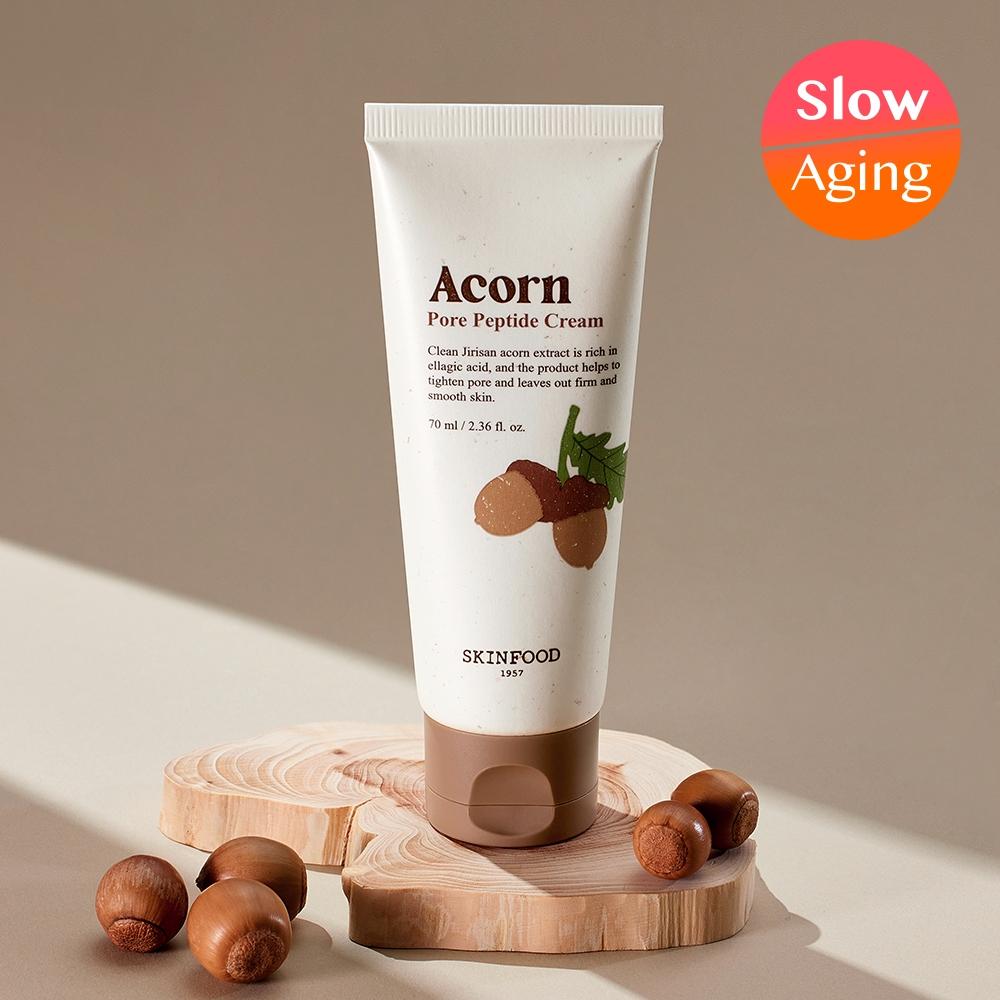 Skinfood Acorn Pore Peptide Cream 70ml is designed to care for rough pores and sagging skin elasticity. This cream provides dual elasticity care for sagging pores and skin inside and out. The pure Jeongmyeong Mountain acorn extract is the main ingredient, rich in tannins that help tighten the pores.