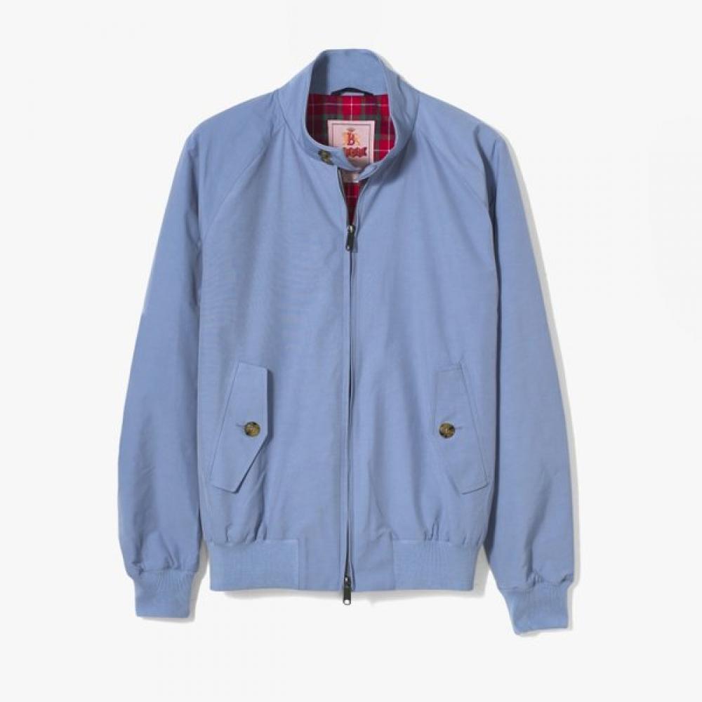 Die Baracuta G9 Harrington Jacke (Staubiges Blau) verfügt über ein Regular-Fit-Design mit typischer Dicke und Gewicht. Es hat eine kurze Länge mit einer etwas lockeren Passform, wodurch es für verschiedene Aktivitäten geeignet ist, und ist aus wasserdichtem Stoff gefertigt, der vor Wind und Kälte schützt.. Die Jacke verfügt über einen Stehkragen mit Zweiknopfverschluss, gerippte Bündchen und einen gerippten Saum.. Der entscheidende Punkt ist das ikonische Fraser-Tartan-Karomuster im Futter und auf dem Rückenteil, inspiriert von einer Regenschirmform, zusammen mit schrägen Taschen, die mit Knöpfen gesichert sind.
