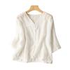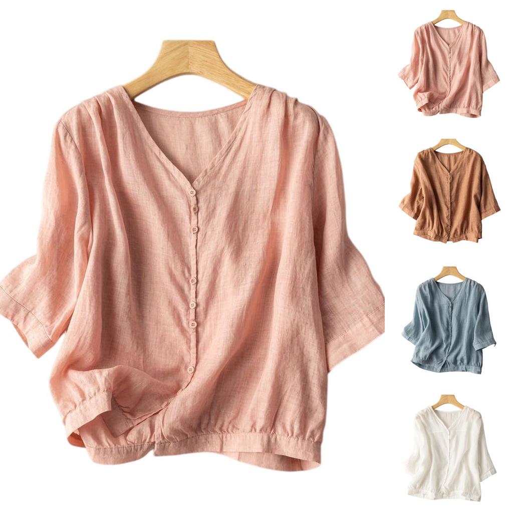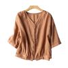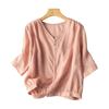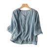 Damen Oberteil im Vintage-Stil, lockere Passform, Baumwoll-Leinen-Mischung, V-Ausschnitt, ärmellang