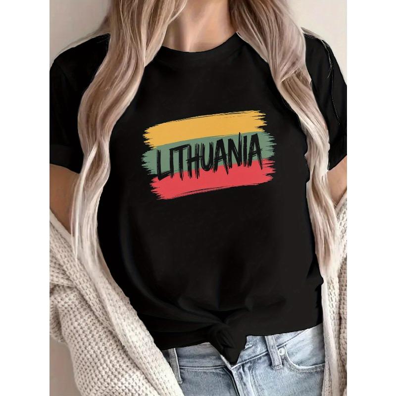 European sizes Lithuania Brush Stroke Flag print t-shirt, short sleeve crew neck casual top for summer & spring, Women's clothing