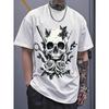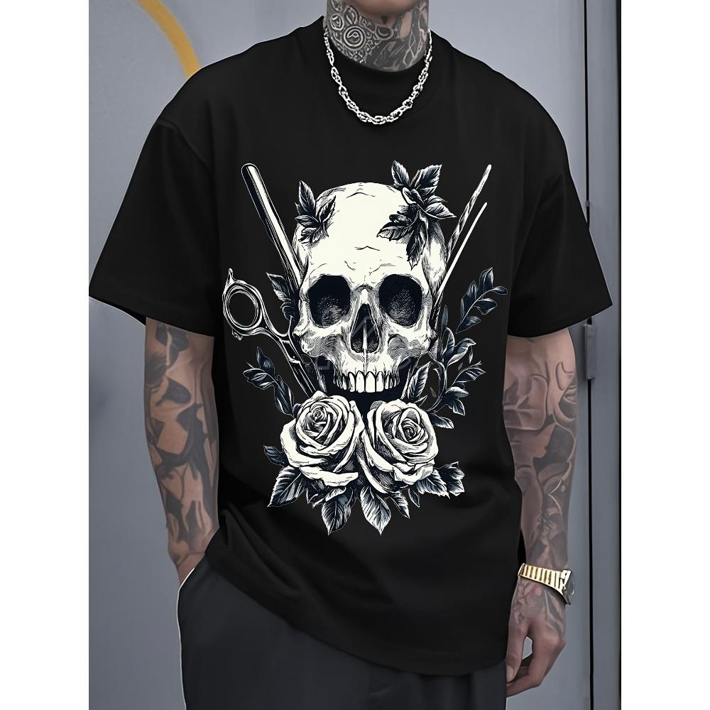Europäische Größen Herren Schädel & Rose Grafik T-Shirt - Streetwear Style Kurzarm Rundhals Sommer Freizeit T-Shirt, Reguläre Passform Kräftiger Print Oberteil für Herren