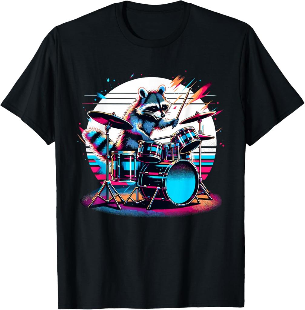 Raccoon Drummer Musician Retro Graphic TShirt Breathable Casual Cotton Tee