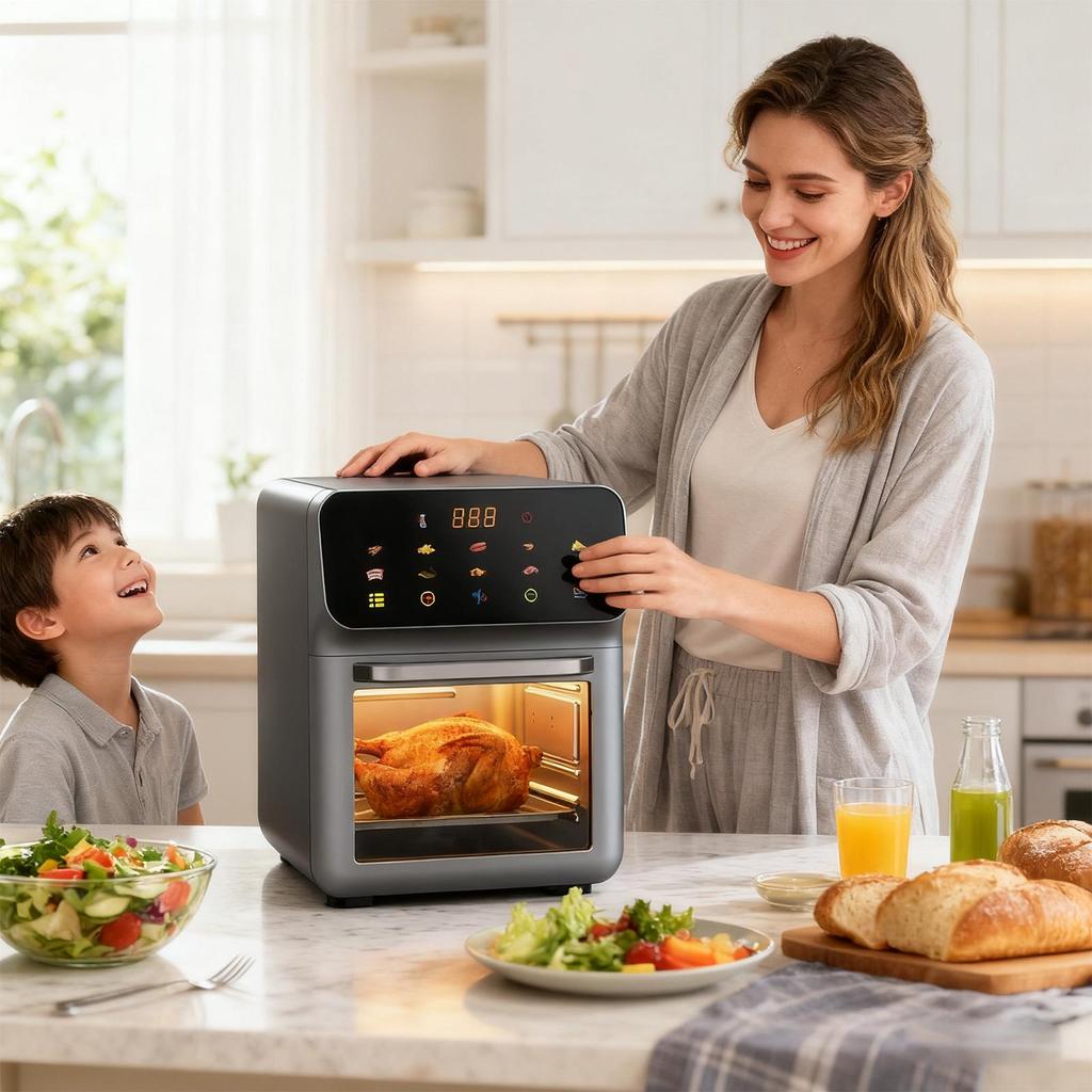 Kombigerät Heißluftfritteuse und Backofen Heißluftfritteuse und Umluftofen Kombigerät 15L Familiengröße Dörrgerät 2-Etagen-Werkzeug für Zuhause Wohnheim Esstisch