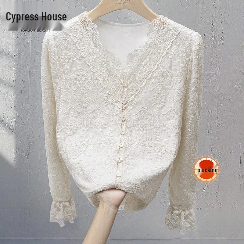 Elegante Damenbluse mit V-Ausschnitt, Spitzenbesatz und Fleece-Futter