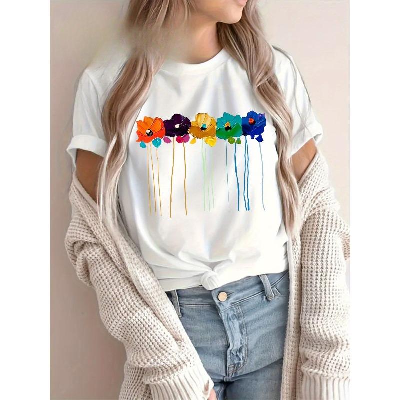 European Size Plus Size, Women's Plus Size Oversized Vibrant Painted Floral Print Short Sleeve T-Shirt - Round Neck Casual Top