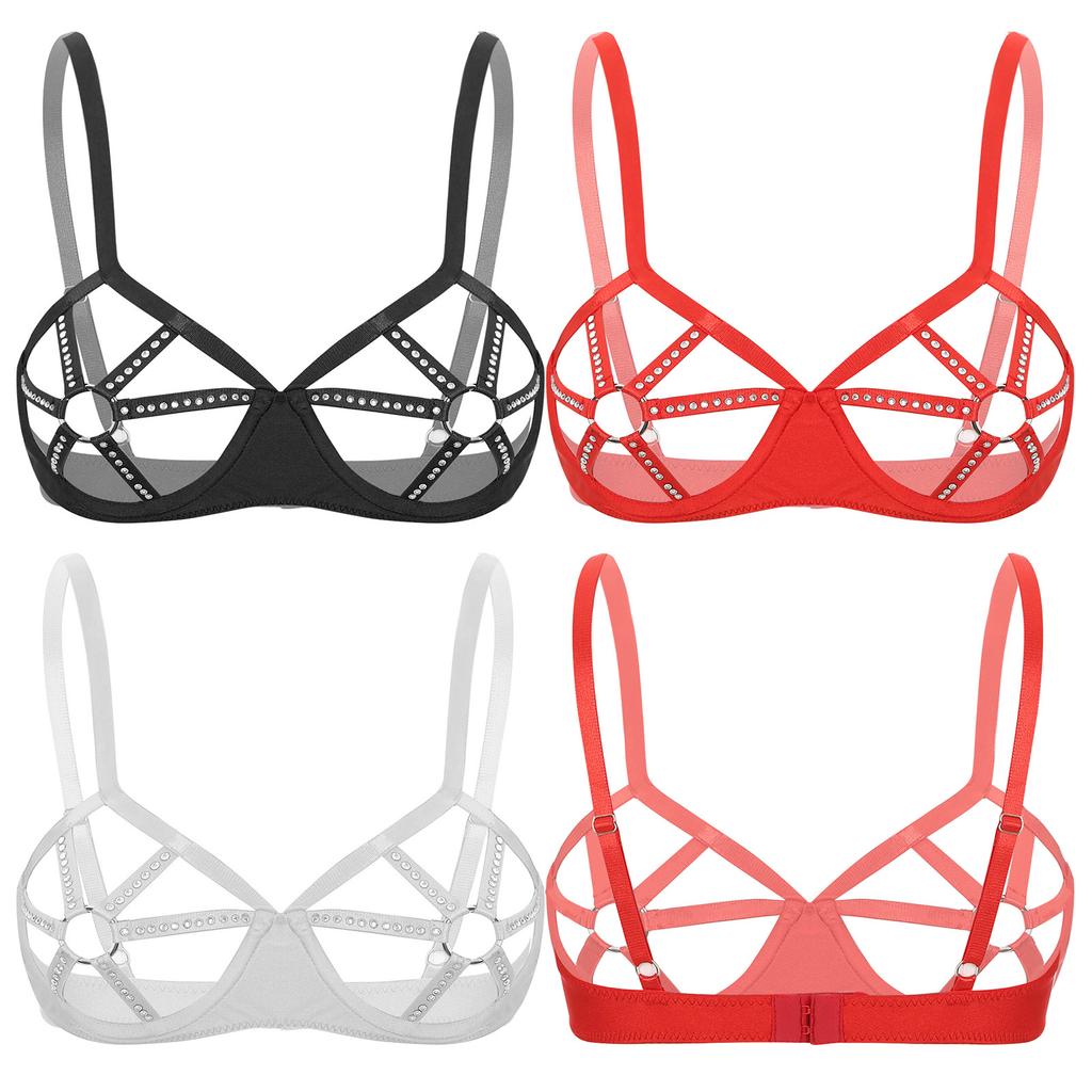 Damen Strass Balconette BH Durchsichtig Bügeldesign O-Ring Ausschnitt Schale Push-Up Top Sexy Dessous